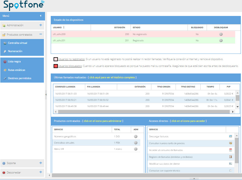 2. Para integrar con Zoho, por favor, ve al menú del lado izquierdo "productos contratados". Cuando se despliegue, haz clic en la primera sección "centralita virtual".