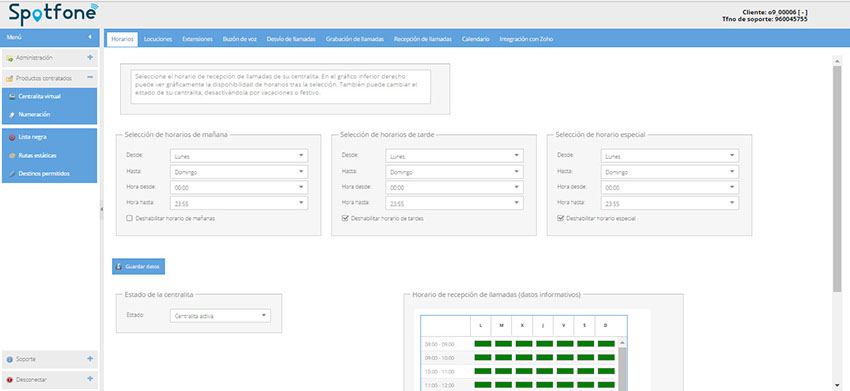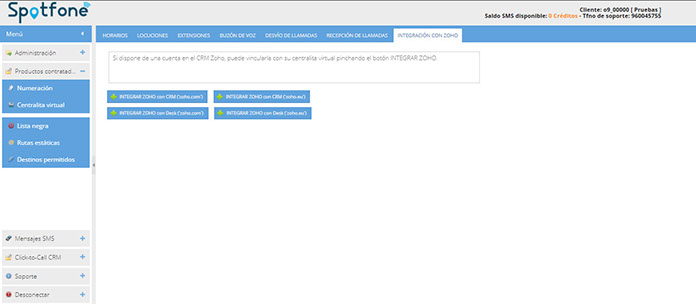3. Una vez abierta la centralita virtual, en la parte superior aparecerá un menú. En este nuevo menú, tienes que entrar en "Integración con Zoho".